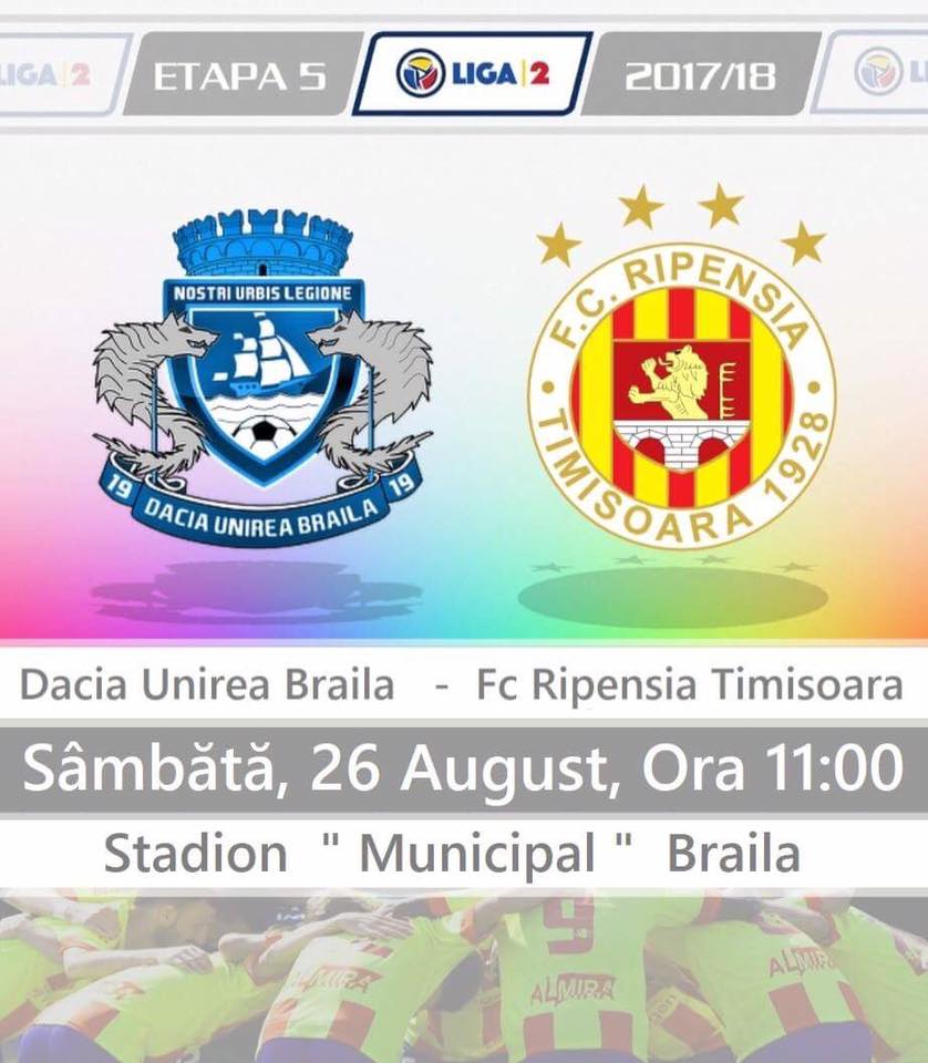 În etapa a 5-a a Ligii a II-a, Ripensia se deplasează tocmai la Brăila, pentru meciul cu Dacia Unirea. Mâine, de la ora 11. Clubul gazdă s-a înființat acum aproape 100 de ani, în 1922, și a evoluat în prima ligă doar câteva sezoane, în perioada interbelică și apoi între 1990-1994. S-a mai numit, printre altele, DUIG, FC, CSM, ...