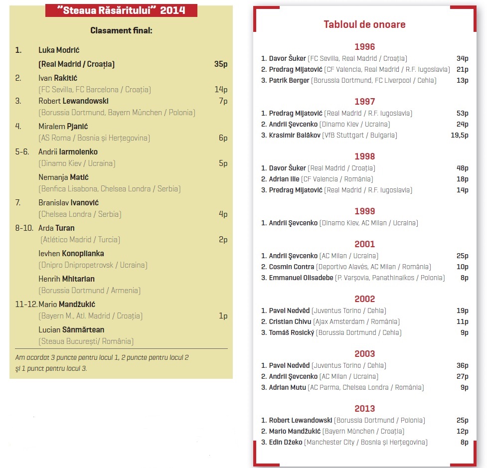 Mijlocașul croat al lui Real Madrid, Luka Modric, a fost desemnat Fotbalistul Est-European al Anului 2014, tradiționala anchetă readusă la lumină de revista ”Ripensia Sport Magazin”, printr-o amplu sondaj în rândul mass-media din Europa. Să vedem rezultatele complete ale acestei anchete…